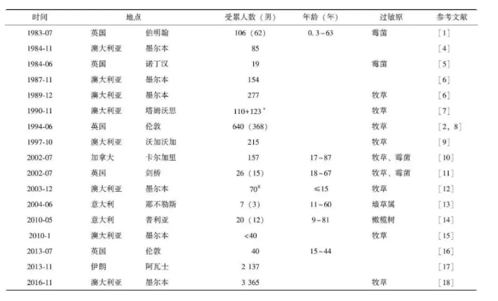 此后,陸續(xù)在全球范圍內均有雷暴哮喘事件的相關報道,主要發(fā)生在英國、澳大利亞,另外加拿大、意大利、伊朗等國家也有類似報道。(下方表格中總結了自1983年以來文獻報道過的雷暴哮喘事件)