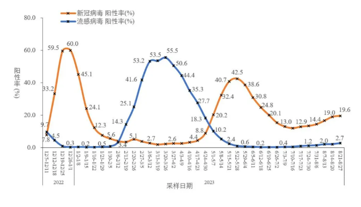 中疾控日前發(fā)布2023年8月全國新型冠狀病毒感染疫情情況顯示,全國哨點醫(yī)院流感樣病例新冠病毒陽性率從第31周(7月31日-8月6日)的14.4%緩慢上升至第34周(8月21日-8月27日)的19.6%。